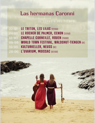 "El Espacio Del Tiempo", the fifth album by sisters Laura and Gianna Caronni, is a poetic exploration of space and time. Playing as a cello–clarinet duo, they also blend their voices together across a repertoire of original compositions and reinterpretations of works by Carlos Gardel, Caetano Veloso, and Alberto Spinetta.